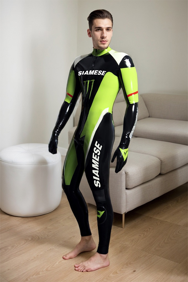 Full-body catsuit designed to replicate branded MotoGP rider leather, with five color options.