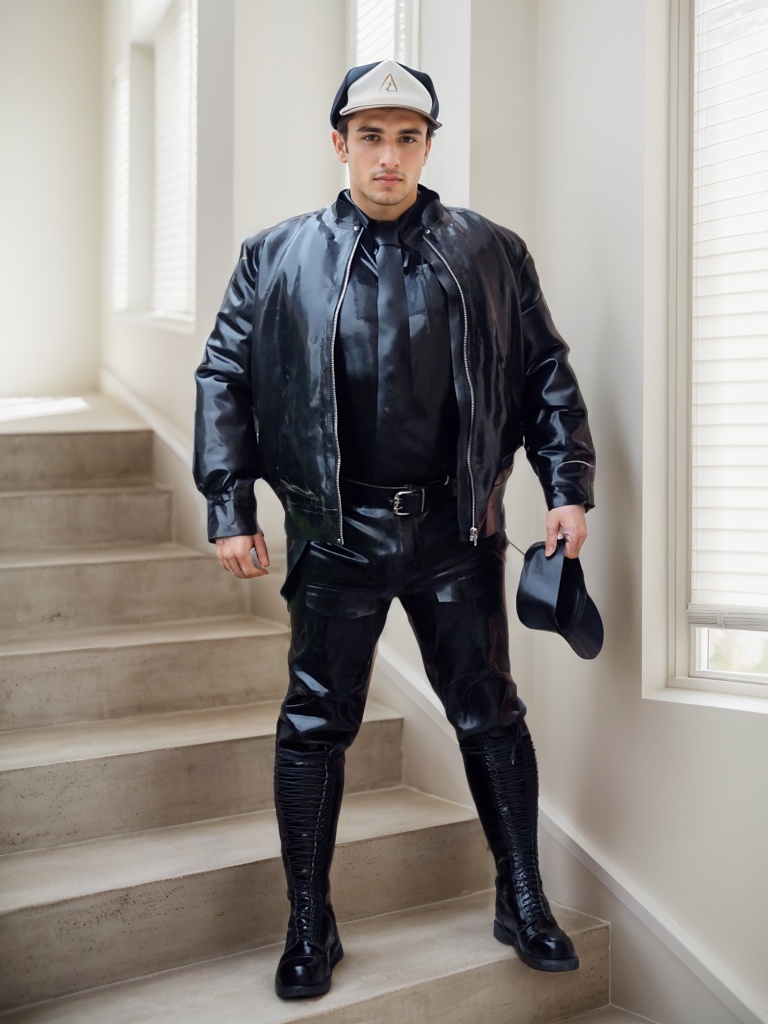 This 'Air Force Flight' jacket is expertly crafted from high-quality, high-shine 1.0 mm natural latex. Its design is a masterful blend of a sleek, utilitarian silhouette with edgy, modern materials, making it a truly unique piece that projects confidence and style.