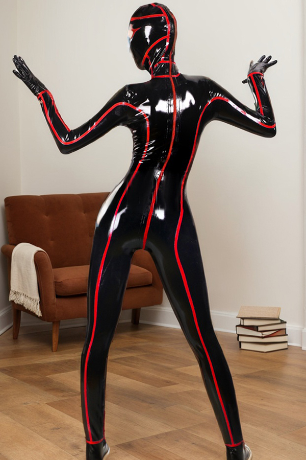 This black latex full-body catsuit, with its high-gloss material, striking ghost white contrast lines, and complete body encapsulation, creates a bold, dynamic, and undeniably sleek aesthetic that transforms the wearer's silhouette into a work of art.
