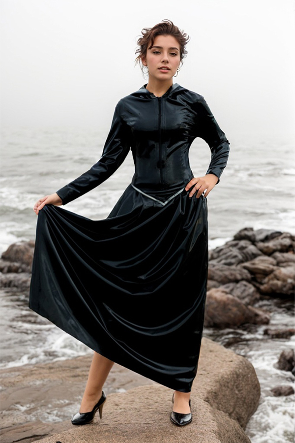 This elegant, full-length latex gown features a high collar, long fitted sleeves, and a tailored bodice that flares into a graceful floor-length skirt. A V-shaped seam at the waistline enhances definition and visual interest. The pull-on design ensures a seamless silhouette, while the front zipper provides both ease of wear and the option to adjust the look.