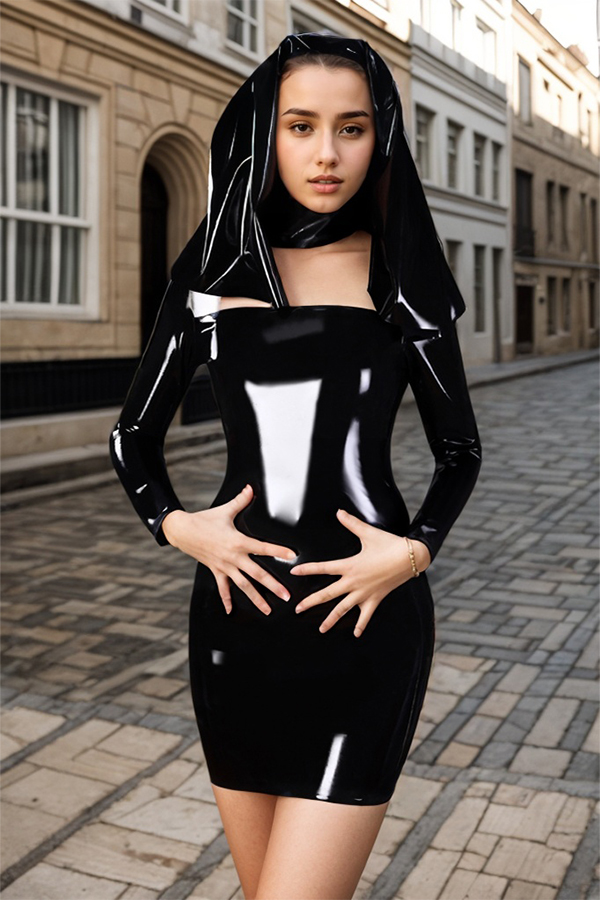 Inspired by gothic nun aesthetics, this look blends themes of discipline, dominance, and allure. The transparent trim adds an edge of mystery and sensuality, making it perfect for fantasy roleplay or avant-garde latex fashion.