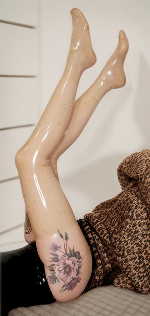 These stockings are crafted from a durable 0.4 mm thick, high-gloss translucent nude latex. The material’s smooth, reflective surface creates a vibrant "wet-look" sheen that intensifies under the light. This luminous quality enhances the subtle nude color and makes the legs look as if they're wrapped in liquid light, adding to the garment's visual impact.